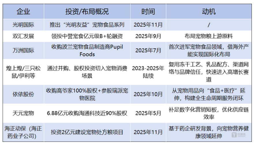 食品企业跨界“争宠”早已蔚然成风。煌上煌、三只松鼠、来伊份、巴比食品、伊利股份、贝因美等数十家上市公司,先后通过并购、股权投资切入宠物消费场景,直接推动国产宠物品牌进入爆发周期。