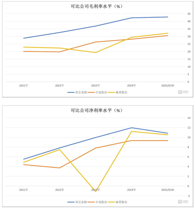 类似增收不增利的困境同样蔓延至同行:中宠股份(002891.SZ)、天元宠物Q3单季净利润分别下滑6.64%、19%;佩蒂股份(300673.SZ)的表现更显严峻,前三季度营收10.89亿元(同比-17.68%)、净利润1.14亿元(同比-26.62%),已连续四个季度出现双位数营收下滑。